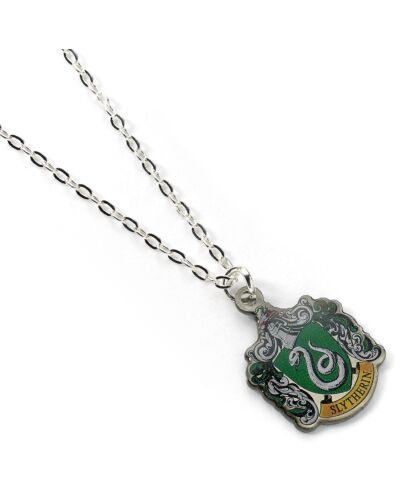 - The Slytherin house crest charm on a silver plated necklace
