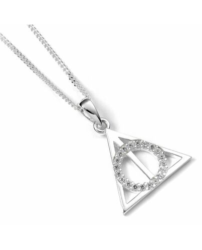 - The iconic Deathly Hallows symbol charm on a sterling silver necklace