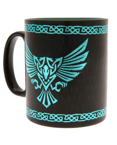 - Black mug with vibrant artwork of the Valhalla crest and Raven