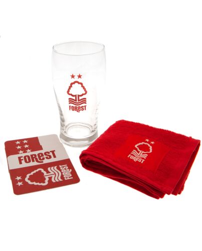 - Mini bar set with tulip style pint glass featuring Forest text and club crest