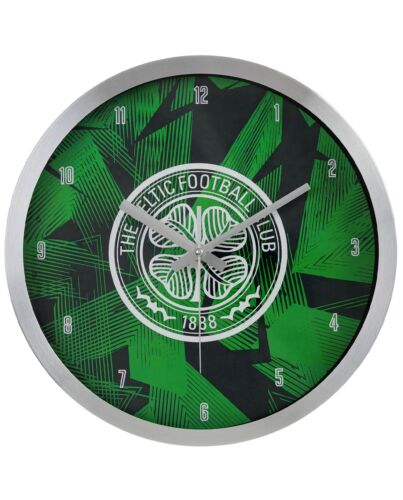 - Metal wall clock with a green geometric design featuring a white Celtic club crest