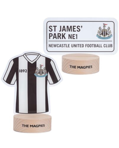 - LED desk light with a wooden base and clear plastic insert featuring a Newcastle shirt and street sign