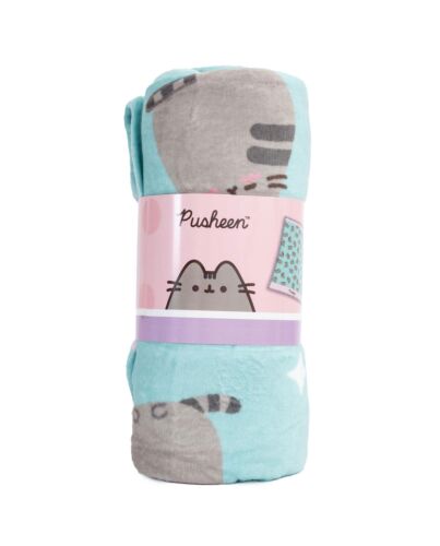 - Mint green blanket featuring a repeat pattern of Pusheen surrounded by pink hearts, with a pink border at the top and the bottom