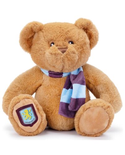 - Wearing a vibrant claret and blue scarf with a Villa crest on the bears paw