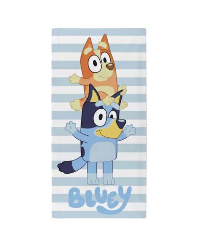 - Vibrant towel featuring Bluey and Bingo on a stripe background